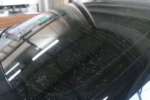 リアガラスが破損すると、本来であれば細かいガラス片が車内外に飛び散り、