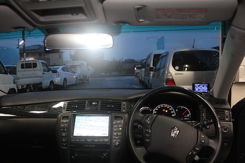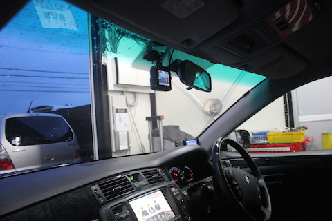 完成!運転手の目線でみると、ドライブレコーダーは、バックミラーの左後ろに隠しておりますので、運転手の視界のジャマにはなりません。