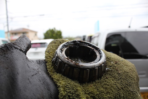 タイヤを回すベアリングも、サビで茶色くなっています。しっかり掃除して、グリスもぬります。