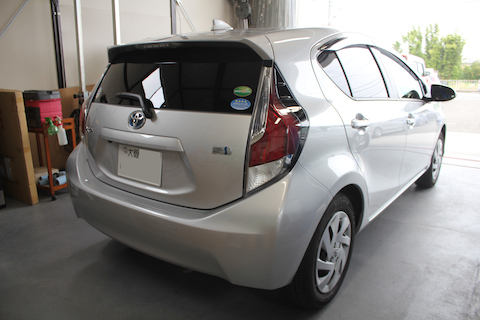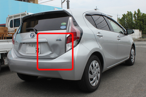 大阪府吹田市より、トヨタ アクアのヘコミ修理でご来店頂きました。リアゲートに出来た大きなヘコミ。