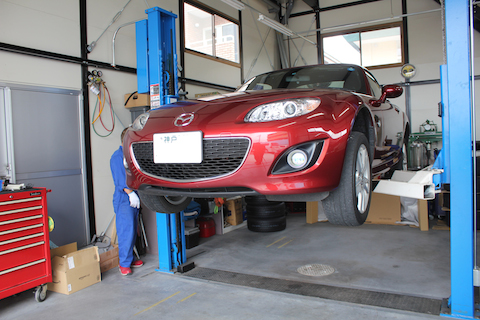 兵庫県三田市より、マツダ ロードスターのご入庫。せっかくなので、リフトを上げて整備チェック。