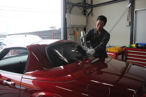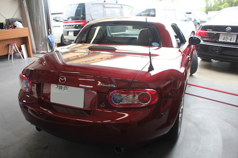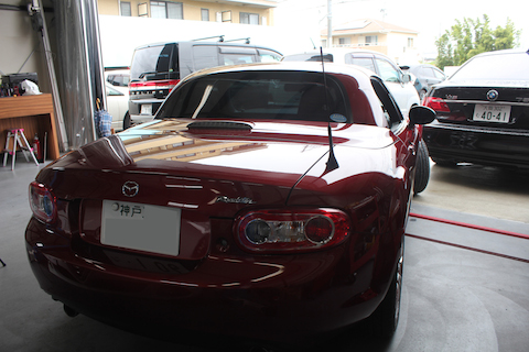 兵庫県三田市より、ロードスターのご入庫。リアガラスのカーフィルムご依頼を頂きました。