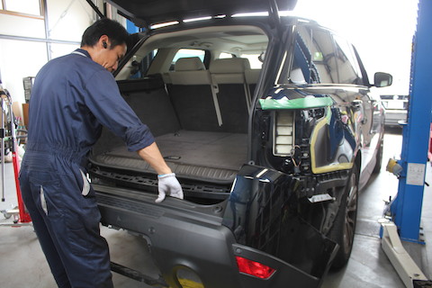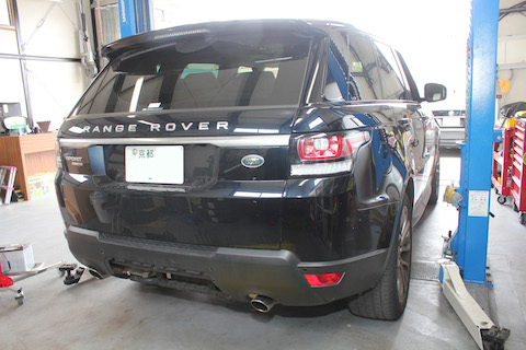 京都府より、新型レンジローバー スポーツがオカマを掘られてご入庫。部品がいくつか欠品している状態。