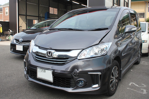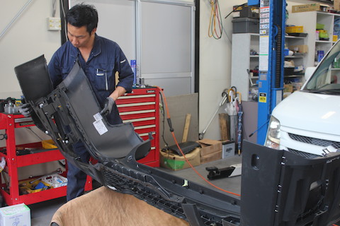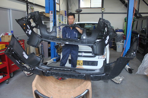 ボンネット・バンパー・グリル・エンジンルーム内のラジエーターやエアコン部品の破損、そしてフレーム修正をする必要がありました。
