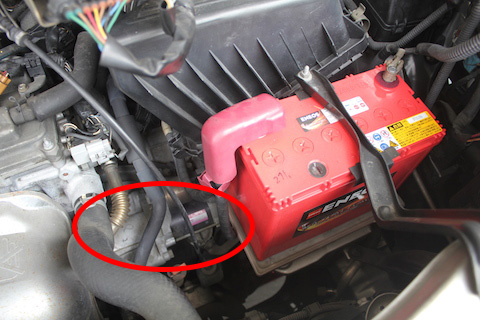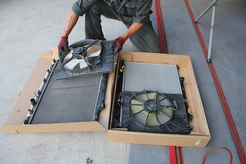 エンジンを冷やす水を冷やす装置が、ラジエーターです。フロントバンパーなどを取り出してからの作業。
