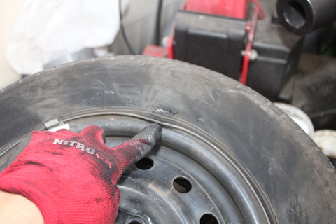 タイヤの側面が破れているので、タイヤは絶対交換。ホイールは、角が曲がっています。