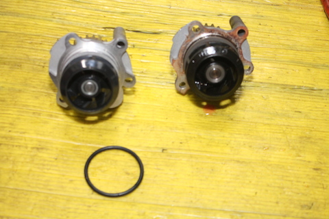 ウォーターポンプを交換。左が新品なのですが、O-リングのゴムが古くなって劣化し、水漏れなどが起ります。