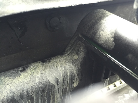 緑の水といえば、エンジンを冷やすクーラント液。早速ラジエーター周りをチェックすると、漏れた跡が残っている箇所を発見。