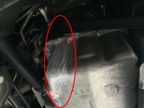 写真右上に、ウォーターポンプがあるのですが、そこから漏れた跡があります。
