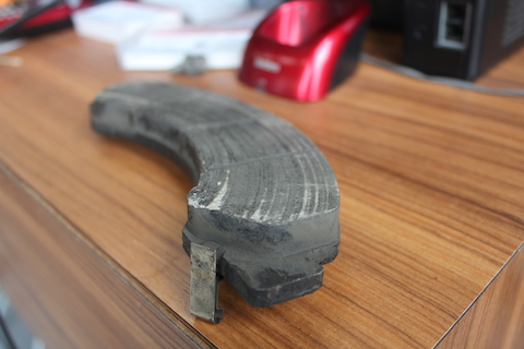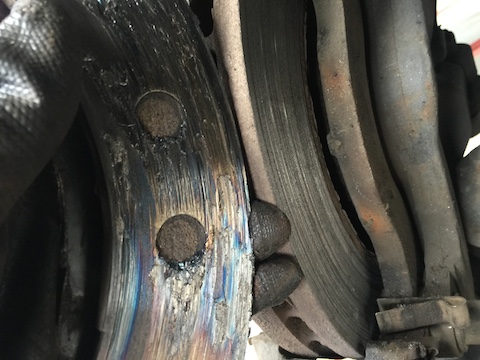 でも、それも放置していくと、写真左のパッドは土台の鉄だけになり、写真右のローターを削ってしまっている状態。