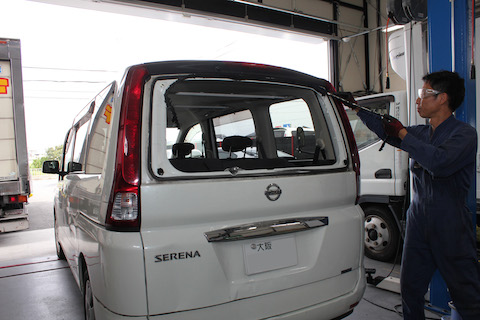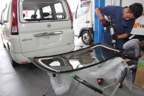 バックで障害物に気付かずに、リアガラスが『バーン!』と割れてしまったので、交換のご依頼を頂きました。