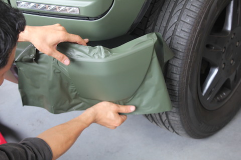パンパーの曲面や直角などにも、真っ平らなラッピングフィルムで、奇麗に施工可能なんです。