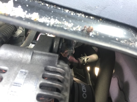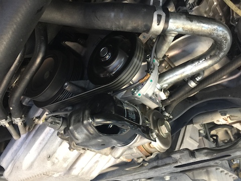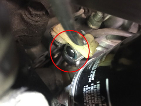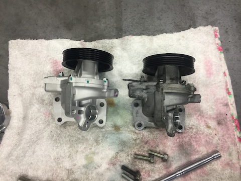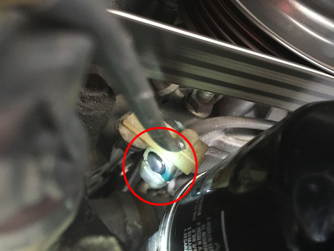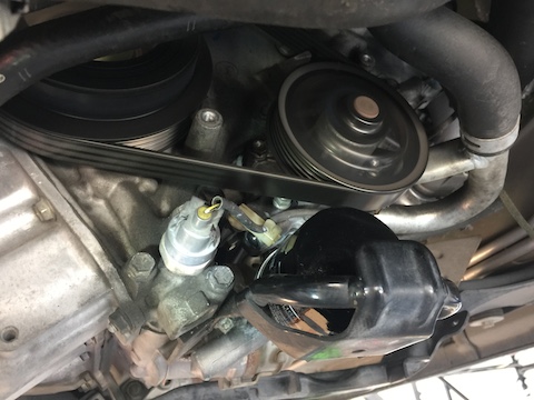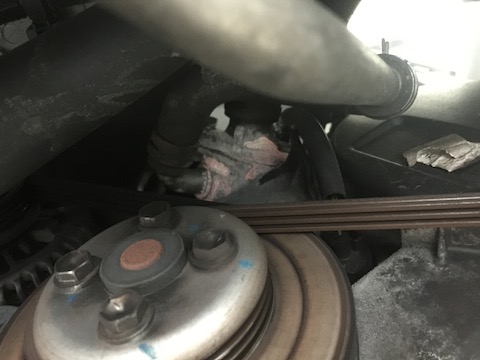 この部分は、ウォーターポンプという場所で、冷却水を循環させる部分。ここから、青い冷却水がもれていました。
