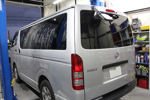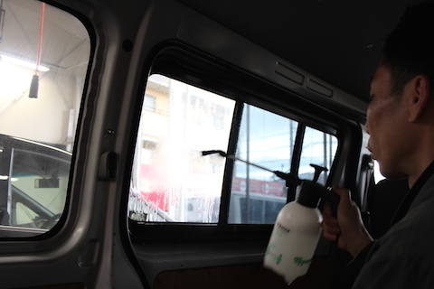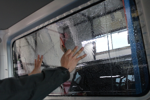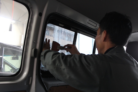 運転席部分を貼るのは違法なので、それ以外の窓を施工し、中を見えなくします。