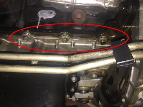 オイルパンとエンジンの間にあるガスケットが劣化し、オイルがにじみ出てしまっています。