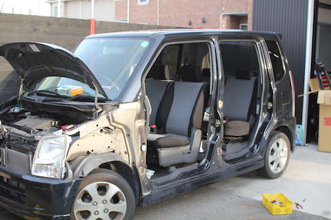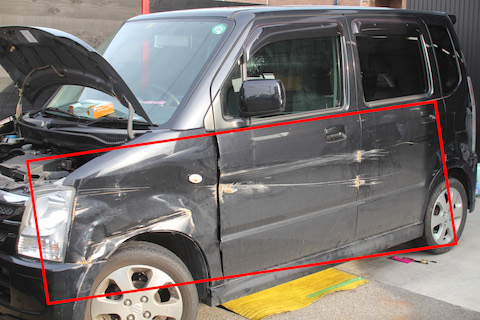 へこみが大きく、板金・塗装が出来ない為、フロントフェンダー・左前ドア・左後ドアの交換になり、高額修理に・・・