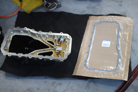 オイルパンを外して、ガスケットの交換。Jeepなのでアメリカ製の部品ですが、問題無く仕入れる事が出来ます。