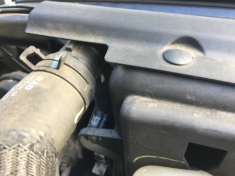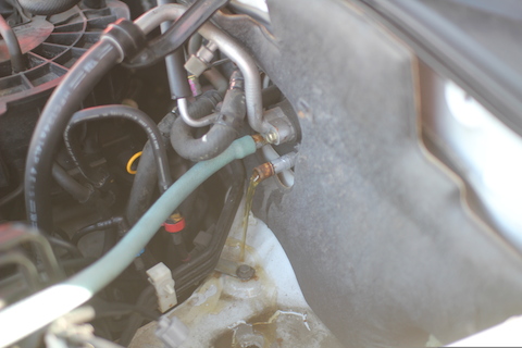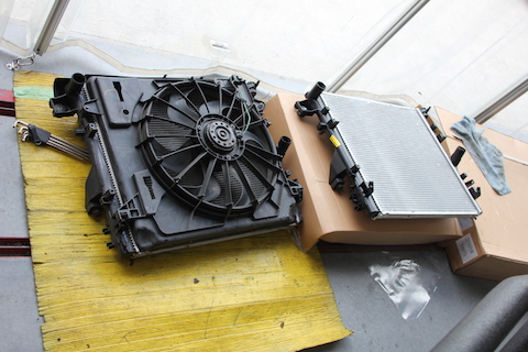 アッパーホース下あたりのラジエーターに赤い漏れた跡が残っています。これはラジエーター本体の交換ですね。