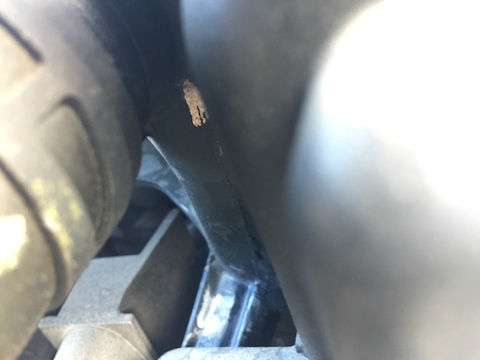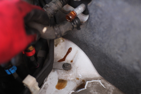 薄赤い水滴が車体の下に落ちているのを発見。