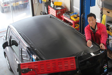 カーラッピングは、寒さで材料が硬くなり施工出来ません。しっかり温度管理しながらのルーフ施工。