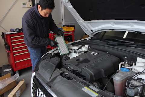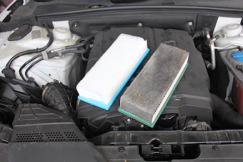 左の新品と比べ、汚れてますね。空気をしっかり吸えないと、エンジンの力を100%発揮できません!