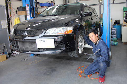 ミツビシ ランサーエボリューションの車検でご入庫。