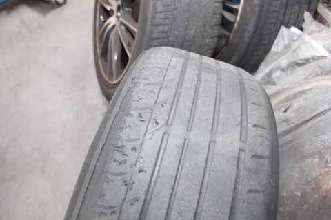 タイヤは、スリップサインに到達し、溝がほぼ無い状態。雨じゃなくても、スリップしている状態でとても危険です。