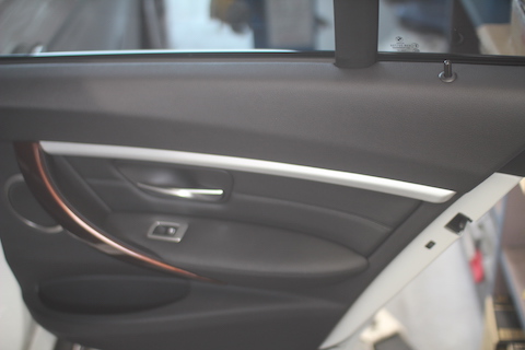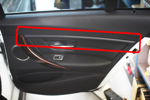 ご依頼は、ドア内装の部品、赤く囲った部分をシルバーにしたいとのご依頼でした。この部分、ドアの内張に接着しており、外す事が出来ないので、この部分だけを塗装するのは困難。