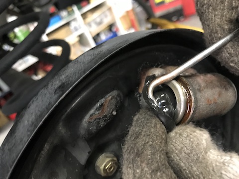ブレーキの油圧シリンダ部分の内部で、オイル漏れを発見。少しずつ漏れているので、ブレーキの効きが悪くなっているのも体感できません。