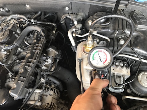 冷却水を補充し、圧をかけて水漏れの最終チェック。