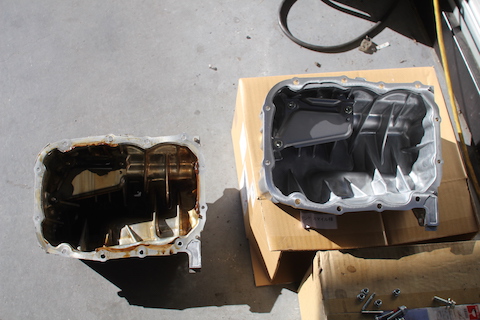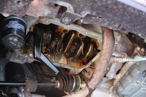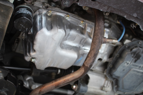 残念ながら、オイルを貯めるオイルパンの交換になります。オイルパンを取り外し、