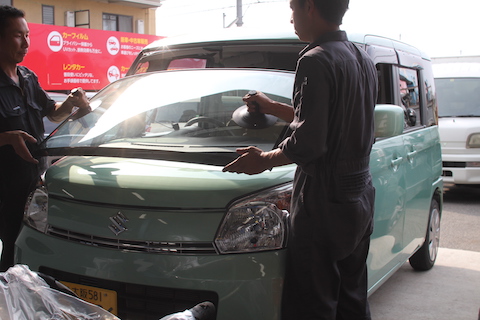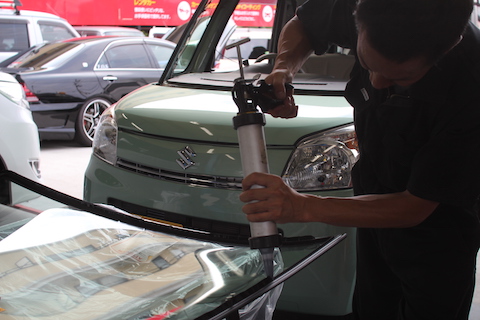大阪府茨木市より、スズキ スペーシアのお客様のフロントガラスに、飛び石被害。すぐに傷が伸びてしまったそうです。