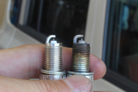 右側の先端が摩耗してるのがわかります。純正イリジウムプラグは3万キロ位で交換が目安ですね。