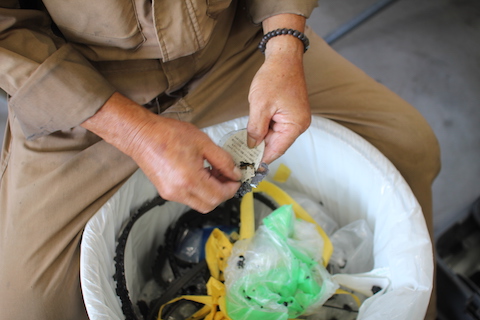 青いバケツに入ってるのが汚れた冷却水。手前の新品と比べたら違いがよくわかります。