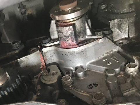 ウォーターポンプという部品から、赤い冷却水が漏れて乾いた跡を確認!