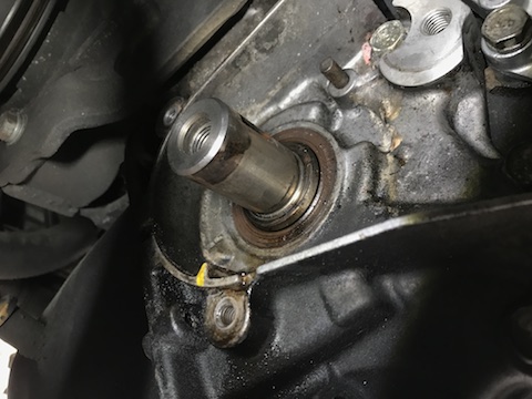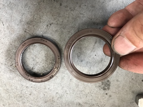 ギアの裏に、シャフトからオイルが漏れない為のオイルシールがあります。オイルがにじんでいます。ゴム製品は、年数が経つと固くなってきますので、