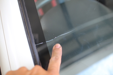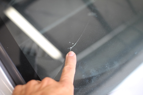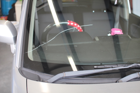 ジムニーのフロントガラス端に近い場所に飛び石被害で、傷が伸びてしまっていました。