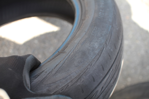 タイヤの側面はヒビだらけ。高速走行で破裂してたら、大惨事!