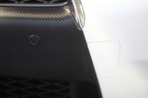 右側の牽引フックカバー部分も含めて、綺麗にラインを作り、左の障害物センサー部もカーラッピング!ラッピングフィルムは薄いので、貼り付けてもセンサーの邪魔をしません。