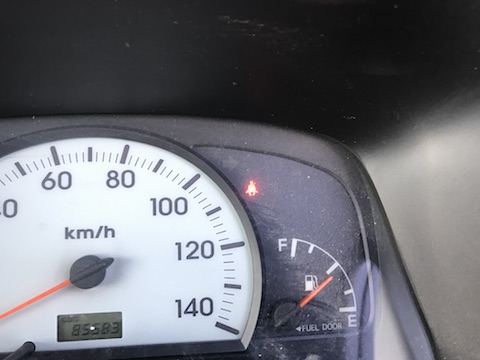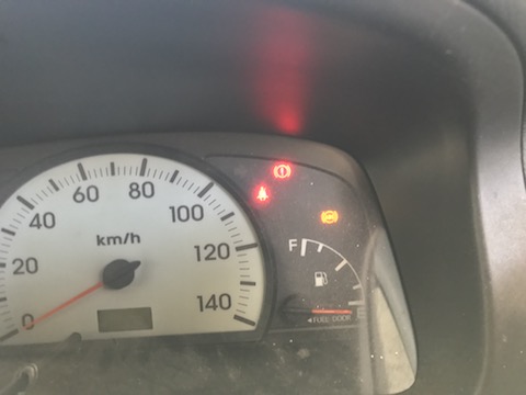 すると、メーター部分に、ABSの警告灯ランプと、サイドブレーキを引いていないのにランプがついています。