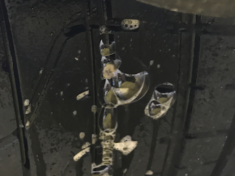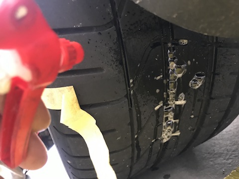 左後ろだけ空気が無かったので、パンクしている箇所を石鹸水をかけて調査。