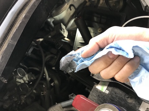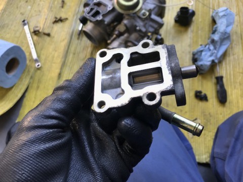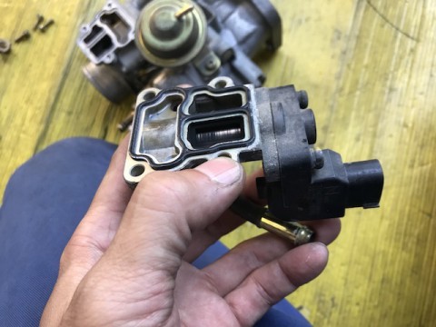 アイドリング用の吸気調整するEGRバルブを見ると、中が黒く汚れで固着していました!これがエンストの原因ですね。