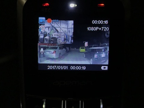 全体に正面の映像、左上の画面にリアの映像が映っています。メモリーには両方がしっかり保存。