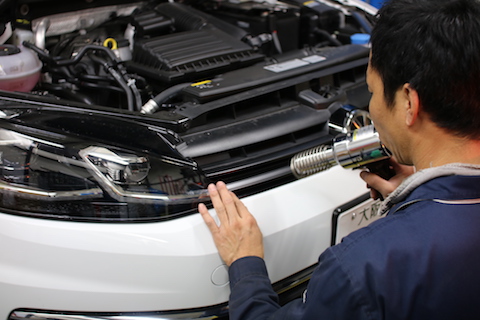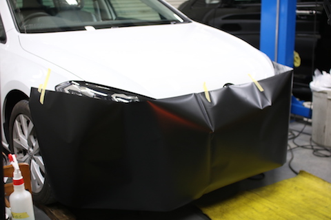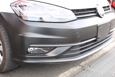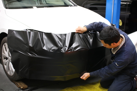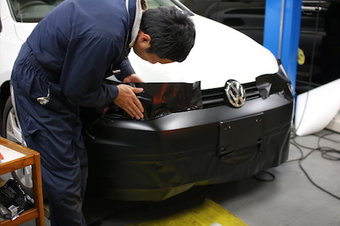 バンパーは、曲面が多いので、真っ平らのシートを貼り付けていくのに、シワの逃し方で品質が大きく変わります。