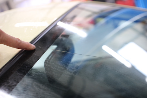 左端っこに当たった飛び石の傷から、すぐに伸びてしまったそうです。端に傷が到達すると、修理はできないのと、車検に合格しません。