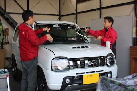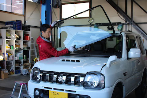 大阪市よりジムニーのお客様のフロントガラス飛び石被害で、フロントガラス交換をさせて頂きました。