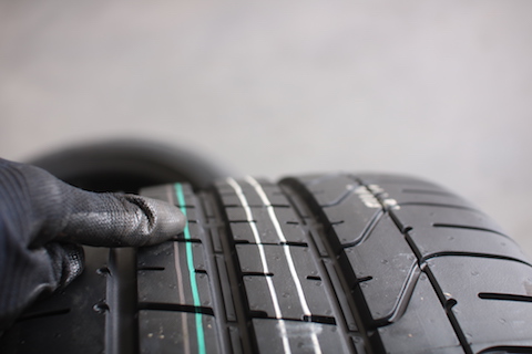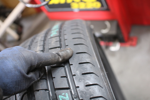 新品タイヤの溝は、スリップサインの突起と比べ、深いのが分かります。