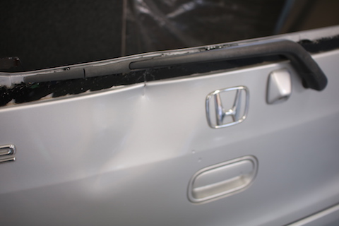 大阪府交野市よりホンダ ライフのお客様、リアゲートのヘコミ修理が他店様で24万円と言われたそうですが、