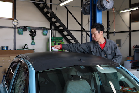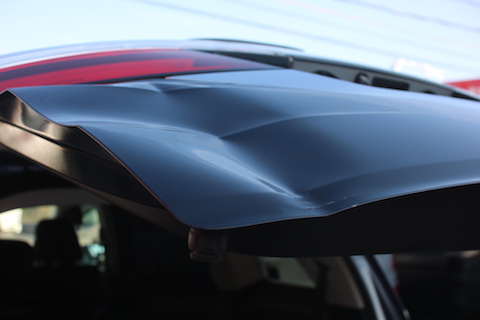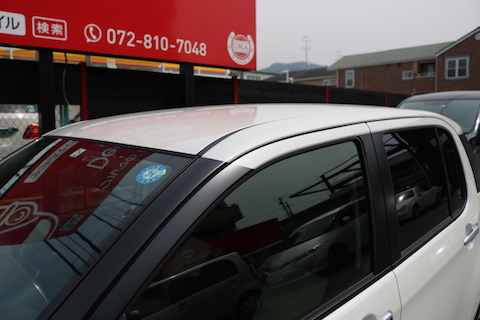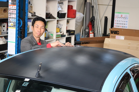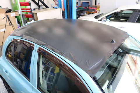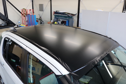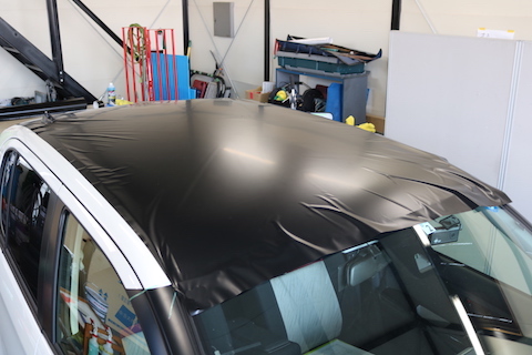 塗装すると車の価値が下がるので、カーラッピングという専用ステッカーを屋根全面に貼り付けます。