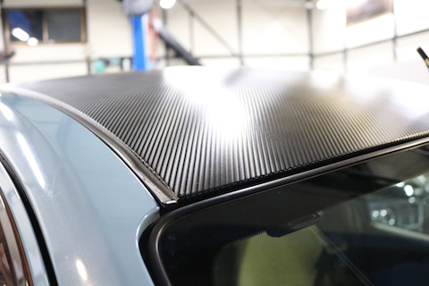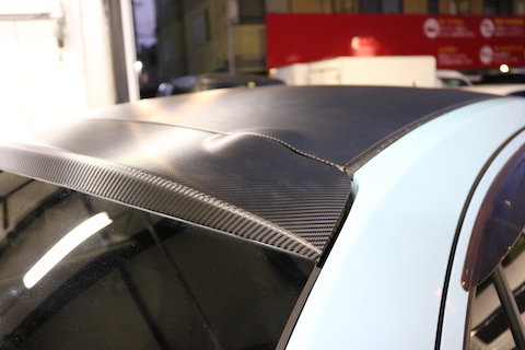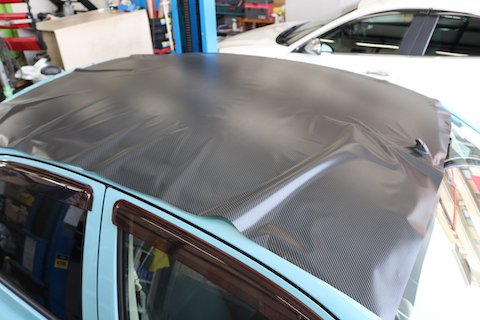 ルーフ部分にカーボンブラックラッピングを施工しました。